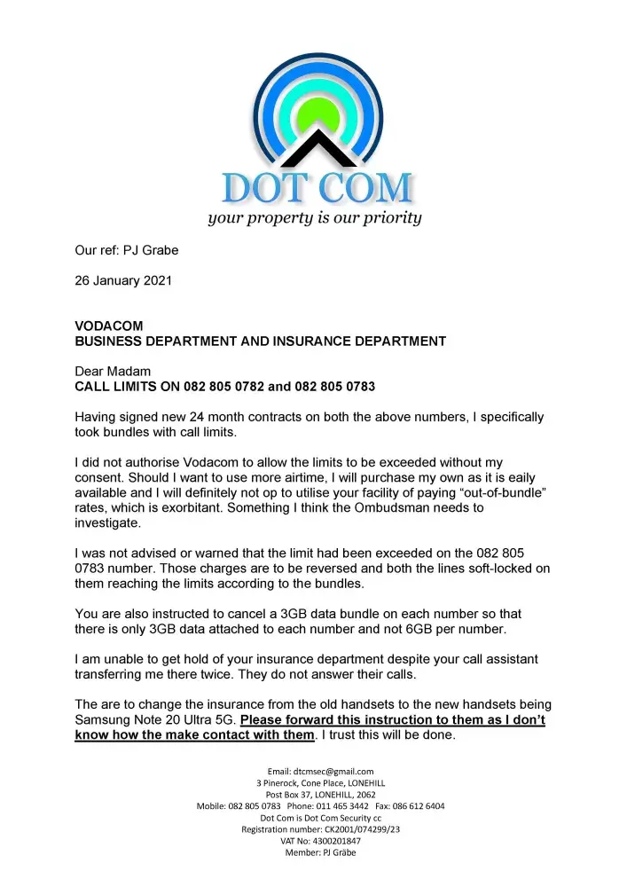 I on the 26th Jan 2021 requested a call limit to be placed on two numbers. I was told to send the instruction on letterhead and copy of ID. I was told to send it from CO email. I did. Got reply that a gmail address is not a CO email address and my query is CLOSED. I emailed back that it is not acceptable and no requirement that domain be purchased to obtain a non-gmail account. Both the above numbers were disabled. Both numbers are attached to business which had to halt as a result of the malicious actions of the staff. The person involved in the emails are a Uwais from this email address: [protected]@vodacom.co.za. This was no accident that the lines suddenly no longer work and the instruction could not be misunderstood.