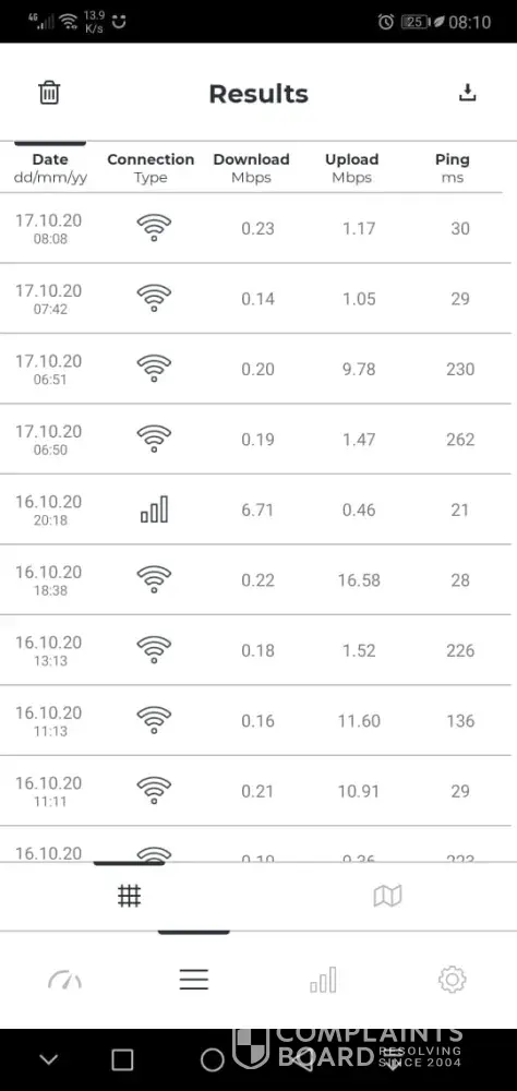 On 16/10/2020 I was not able to log onto my work servers. When testing the speed I found that both upload and download was less than 1 Mbps.