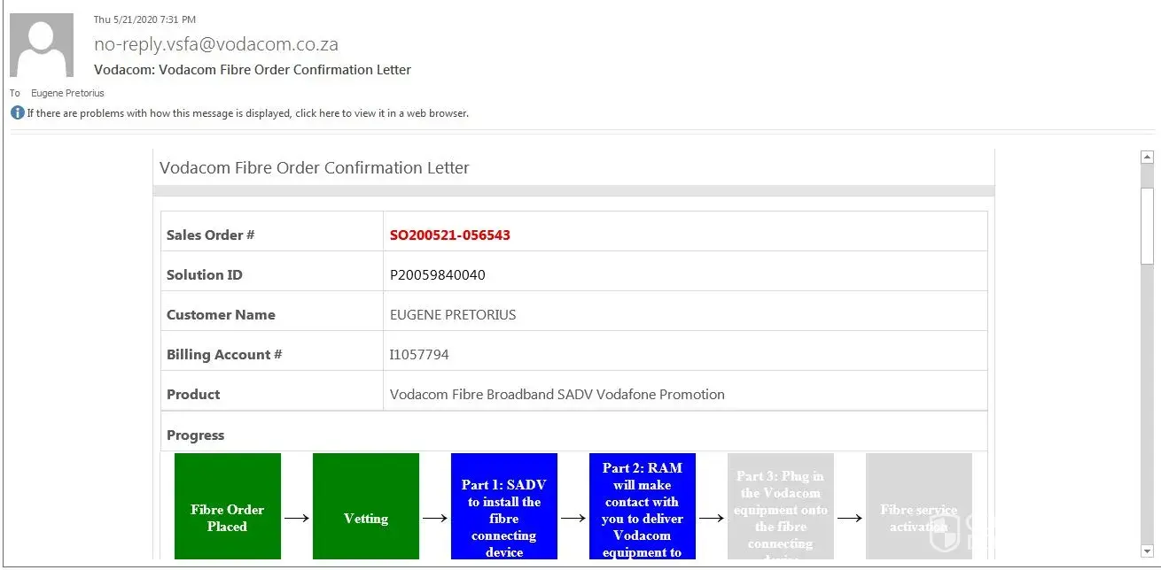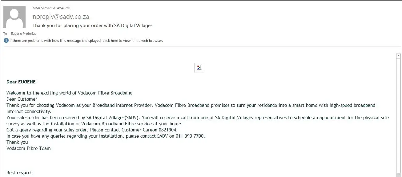 I then received a mail from SADV: 25 May 2020 (Till today I have not received any call with regards to my installation)