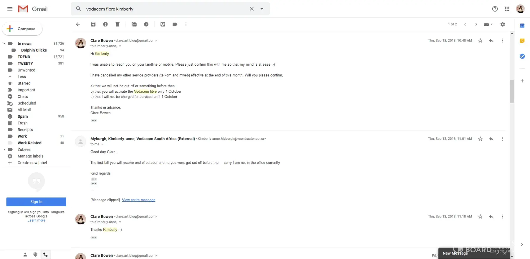 My problems with your Vodacom Fibre department started over a year ago when I first took a contact with you and was assured that it would not be activated prior to my informing you that my Telkom/Mweb connection would expire. Please see attached email proof of numerous requests and confirmation from one Kimberly Myburg, and her subsequent ingnoring of me in further correspondence. I was billed a month early, costing me double internet fees for a month (both Vodacom and Mweb/Telkom). I was never refunded this money. And to top that, my landline was dead for 2 weeks thanks to you.