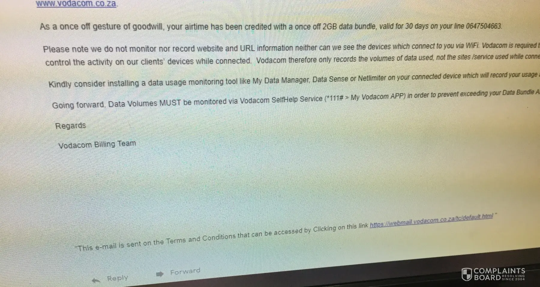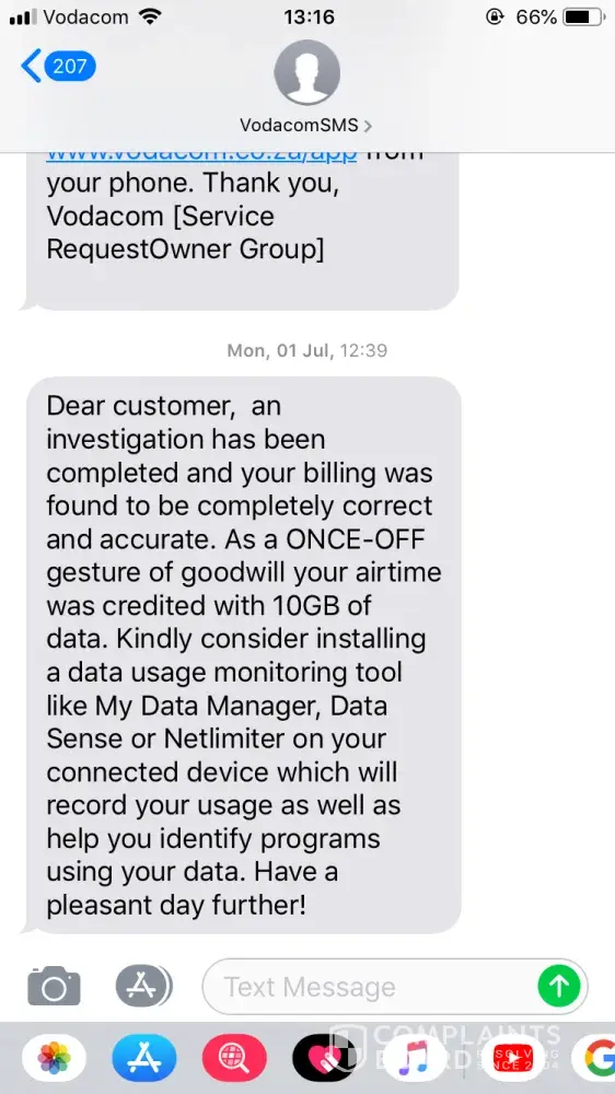 10:56, I receive an sms that my query has been closed and that my data usage is accurate. I am then told as a good gesture I have been credited with 1GB data bundle. What a joke!