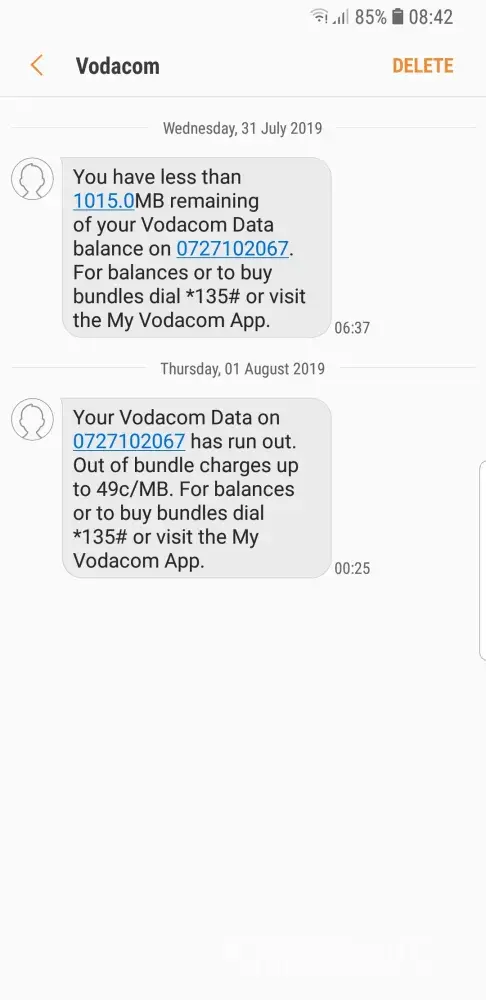 Yesterday 31.07.2019 I got a SMS from VODACOM stating that I have less than 1015.MB remaining.