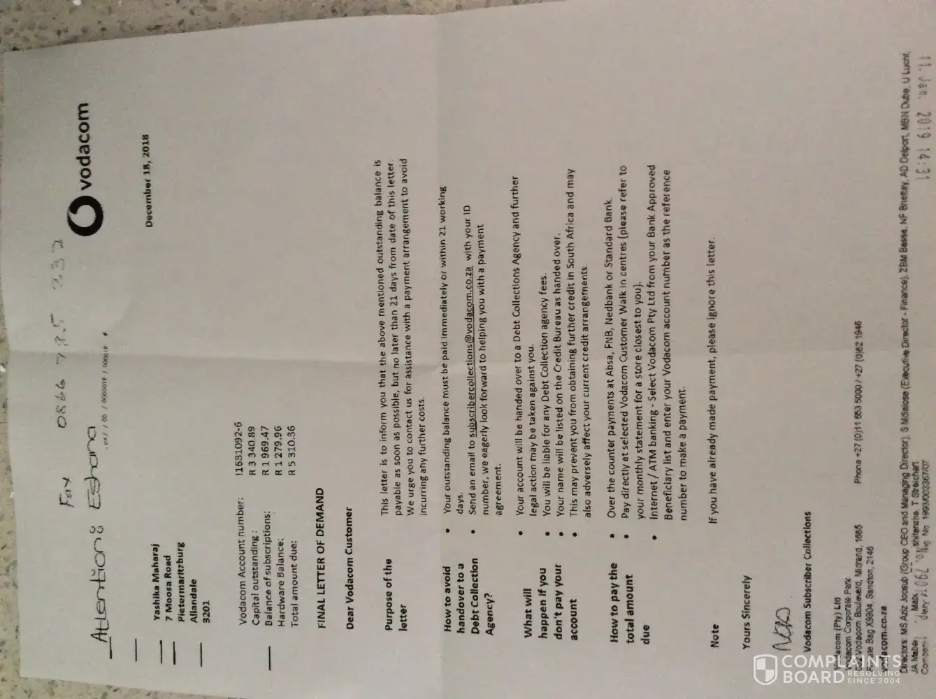 My account has never been in arrears by the amount stated on the Final Letter of Demand dated 08 October 2018. I have made numerous calls to Vodacom Customer Care and forwarded correspondence to every possible e-mail address made available to me, yet nobody is responding to my queries and no one seems to be in a position to assist me or provide me with any information regarding this claim.