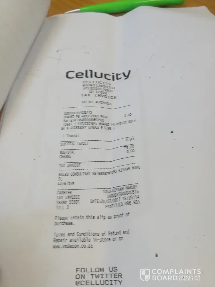 I am an extremely unhappy customer, on the 20 July 2017, i took out a contract at cellucity in Kenilworth Centre, namely the Huawei P9 @, R299 x 24 months. No where in my contract or during my discussions with the consultant KIYAAM Manuel was it mentioned that there would be a hefty price increase, besides the fact that KIYAAM actually tried to keep behind the free items that was in the box with my hand set, (I only realized afterwards that the items were not given, and when I went back he made like he had forgotten to give it to me), Also Pls note I paid for a sim but received a receipt which said the value was R0. 00. On going back to the branch to query the increase, no one, not even the manager could explain why this has happened as they stated it's a vodacom contract and they just do the sale(terrible service I think!)
