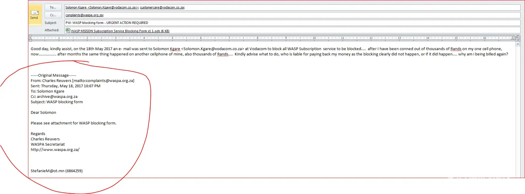 Good day, kindly assist, on the 18th May 2017 an e - mail was sent to Solomon Kgare at Vodacom to block all WASP Subscription service to be blocked... after I have been conned out of thousands of Rands on my one cell phone, now... after months the same thing happened on another cellphone of mine, also thousands of Rands... Kindly advise what to do, who is liable for paying back my money as the blocking clearly did not happen, or if it did happen... why am I being billed again?