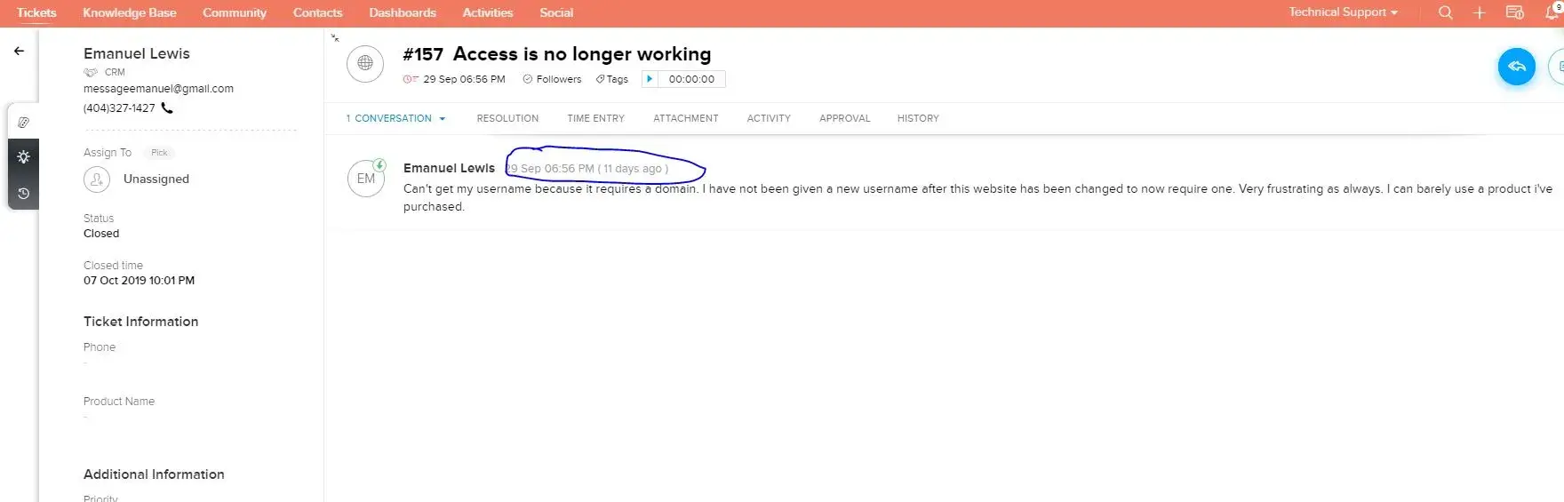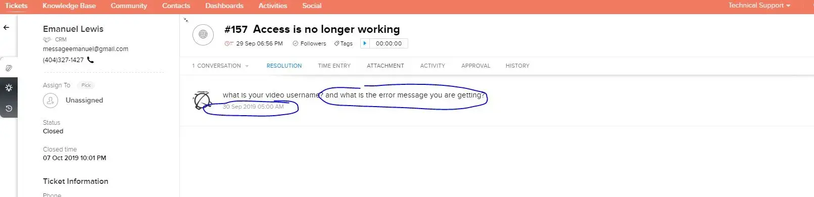Well his Video is well protected. It requires valid user id and password. You did the right thing by opening ticket but failed to response him (Based on the screenshot). So stop making false and irreverent complain.