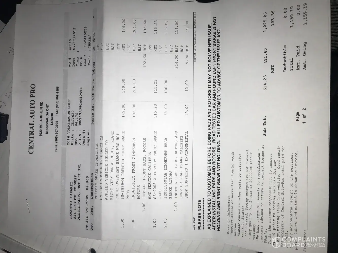 There are a lot of problems with this situation. I was entitled to warranty from the beginning. I almost got into several accidents because of my brakes. My appointment was blown off. Inconsistent information was given to me over the phone. The wrong part was sent to my mechanic. I was spoken to dismissively by both head office and the service department at 401 Dixie. My view of Volkswagen has been completely ruined from this experience.