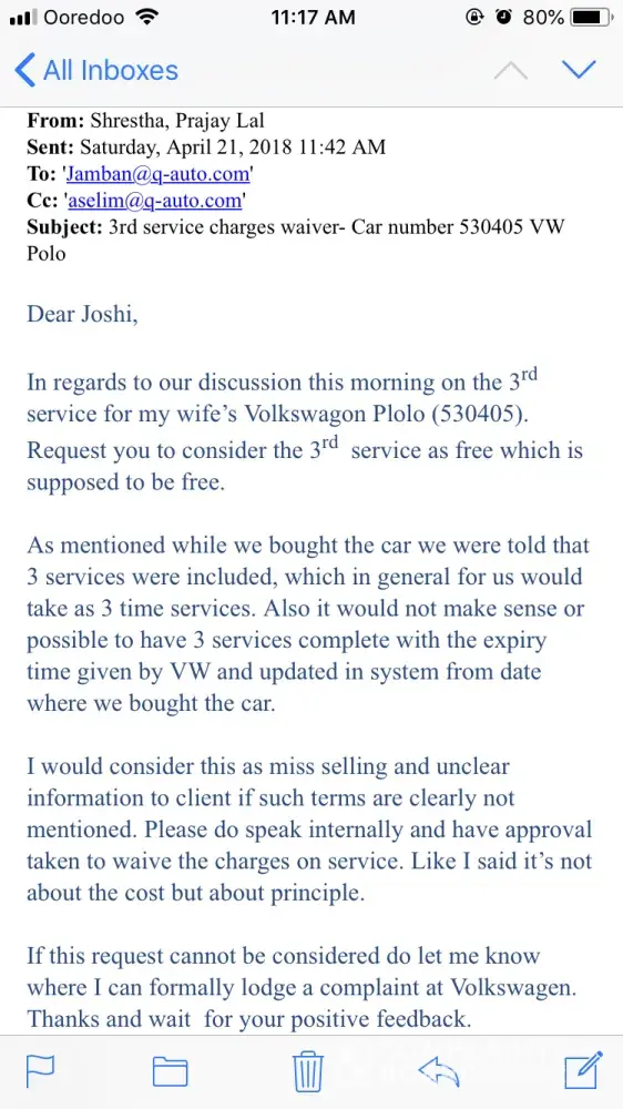 I bought Volkswagon Plolo on the year 2015 frm Q auto as they are the authorized dealer in Qatar, during the purchase I was promised that the servicing charges will be free for three years. Now when it was time for service they told me that I had to bear all cost.