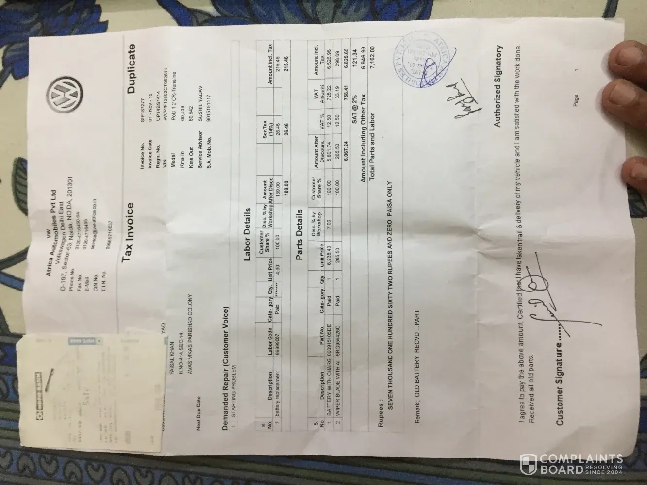 I have just got an invoice of a wiper blades replacement.nothing mentioned about the battery replacement. kindly look into the matter seriously.