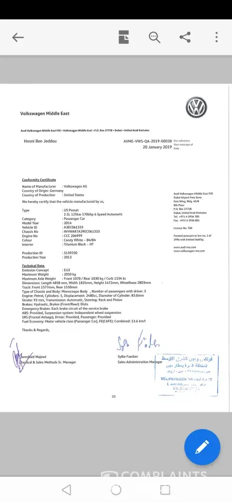 Unfortunately, Volkswagen Middle East were not professional and after asking for the car papers and promising to give the certificate, said that the employee in charge of this matter is on leave, which I find ridiculous