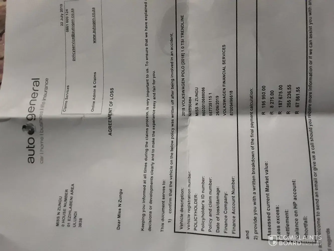 On the 22nd of July I recieved feedback from my insurance company; apparently they had recieved a settlement letter from VW Finance. I have attached an image of the statement of the breakdown of the payment to VW Finance; as e-mailed to me by Auto and General. I was informed that since the funds had been paid in electronically; they would only reflect on VW Finances system within 3-4 working days from the day it was paid in (22 July 2019)