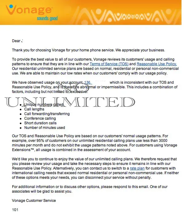 Recently you were informed that your account, XXXXXXXXX, shows unusually heavy and/or irregular patterns of use. This usage is not in compliance with the Vonage Terms of Service that you agreed to when you signed up. You can still remain on your current plan, but you will need to change your usage to fall within normal residential use guidelines, which generally includes using less than 3, 000 international minutes per month.