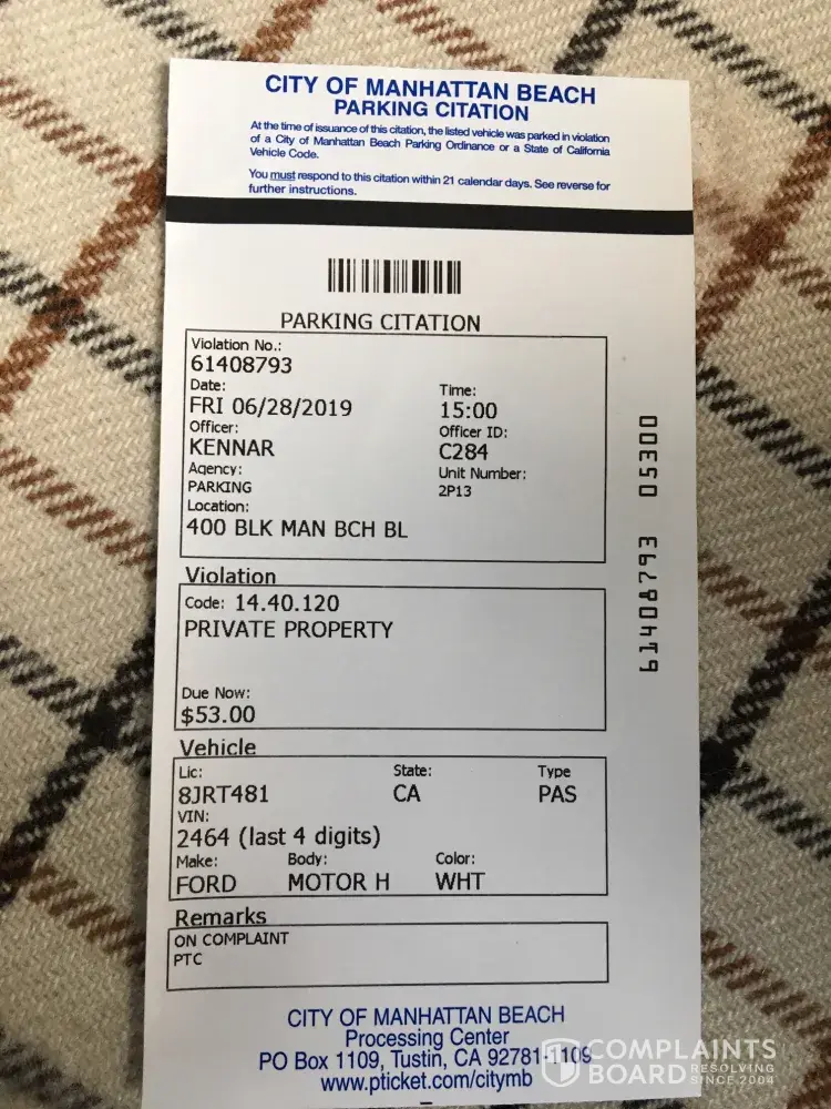 Read full complaintparking ticket at vons - having parked and rv going shopping