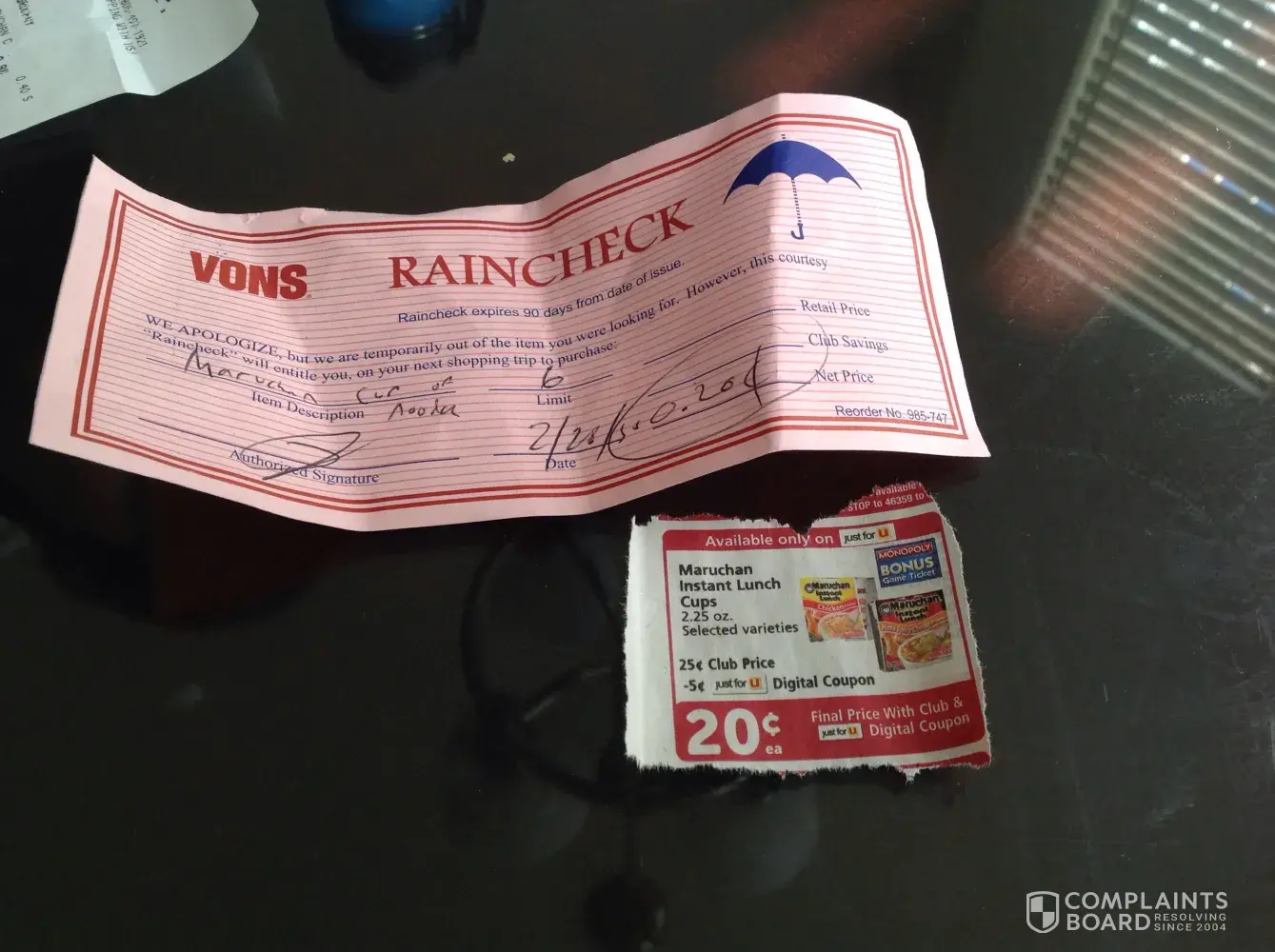 On February 20, 2018, I visited a vons store in westlake village to buy some instant noodles using the price advertised in the newspaper. That day, the store ran out of noodles and I asked for a rain check. When the cashier wrote a limit of six, I was confused and brought it up to the manager, despite having the newspaper say no limit. The manager even ended up saying that I shouldn't have received a rain check in the first place! I've been shopping at other grocery stores including other vons stores for years now, and an incident like this has never happened to me before. I find this unfair to customers and that's why I complained today.