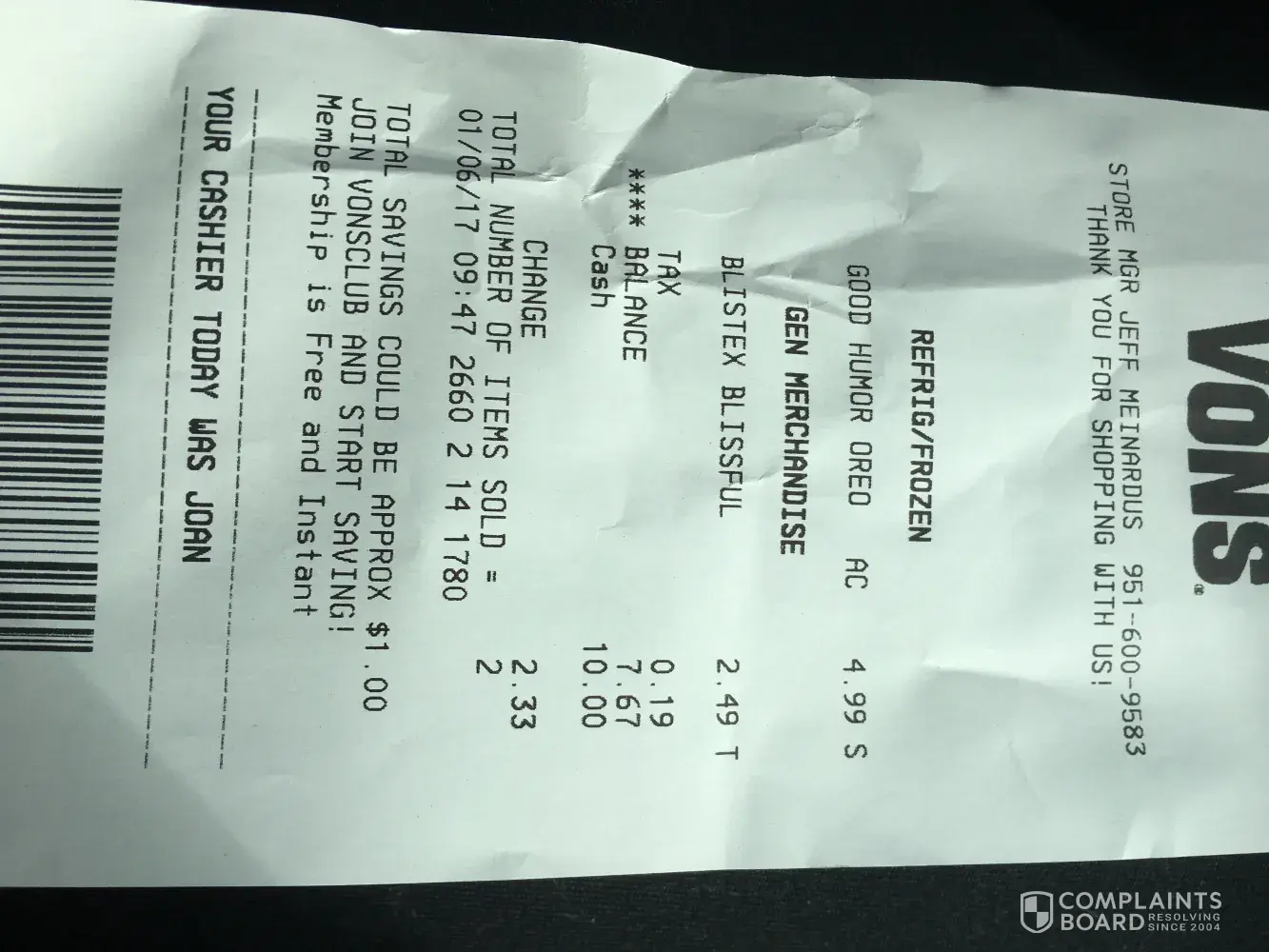 I am mariane castillo who is a visitor to US. I just went to vons store today january 6, 2017 to buy 2 items. One is good humor oreo which cost 4.99 and the other one is blistex blissful that is 2.49. It totals 7.67 where .19 is the tax. I gave 10$ and joan the cashier only gave me 2$. When she gave me 2$ I was already confused but was looking at the receipt since maybe I don't know how much tax is being put on it. So when I decided to check it now and computed everything, she lacked 33cents change. I know it is just 33cents lack but if she does that to many customers she would be getting so much money where she doesn't supposed to.