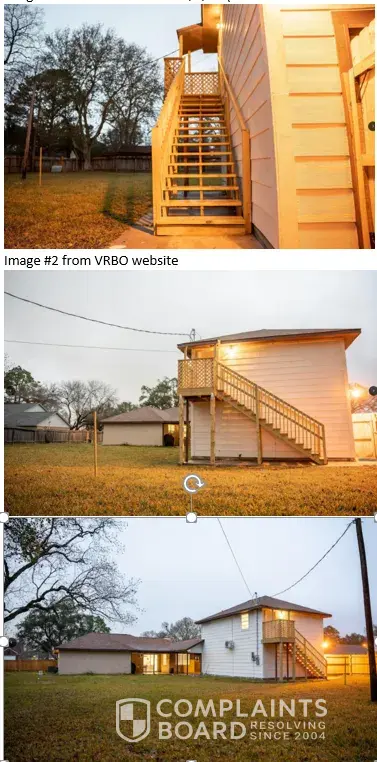 4. In addition to the problems described above, our major complaint is that the property was not as described on the VRBO website. We were traveling with our two mid-size dogs. One of the main reasons we chose this rental unit was because it was advertised as having a large yard which would allow us to safely walk our dogs in the yard, without venturing into an unknown neighborhood. The VRBO website shows pictures of the large yard. The pictures of the property show the entire yard available and that is how the property was advertised. We have pictures from the website that we can provide, however, your instructions said your system cannot accept photographs. However, upon arriving there was not a yard, just a small fenced-in area around the landing at the bottom of the stairs leading to the unit. We have pictures of the actual yard that we can provide, however, your instructions said your system cannot accept photographs. The advertisement of this unit with a large yard was a misleading and fraudulent representation of the unit.