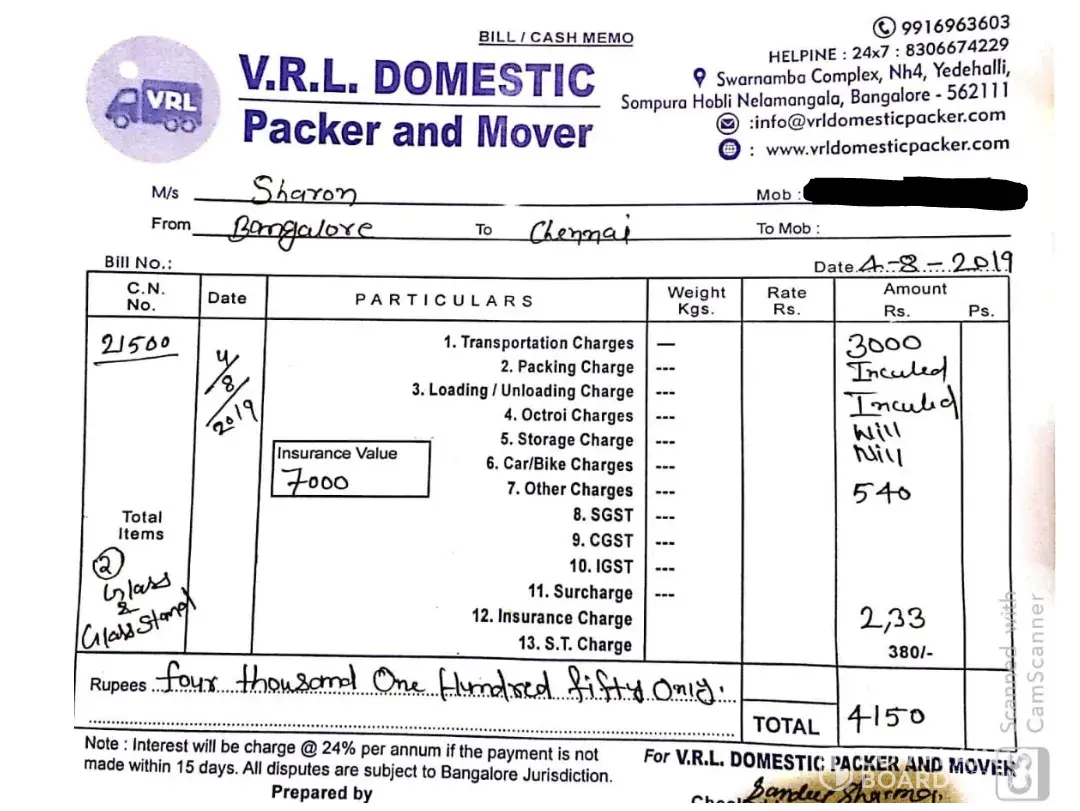 My experience with VRL as you can imagine has been very bad. Considering their lack of professionalism and mistrust, I strongly recommend against VRL packers and movers.