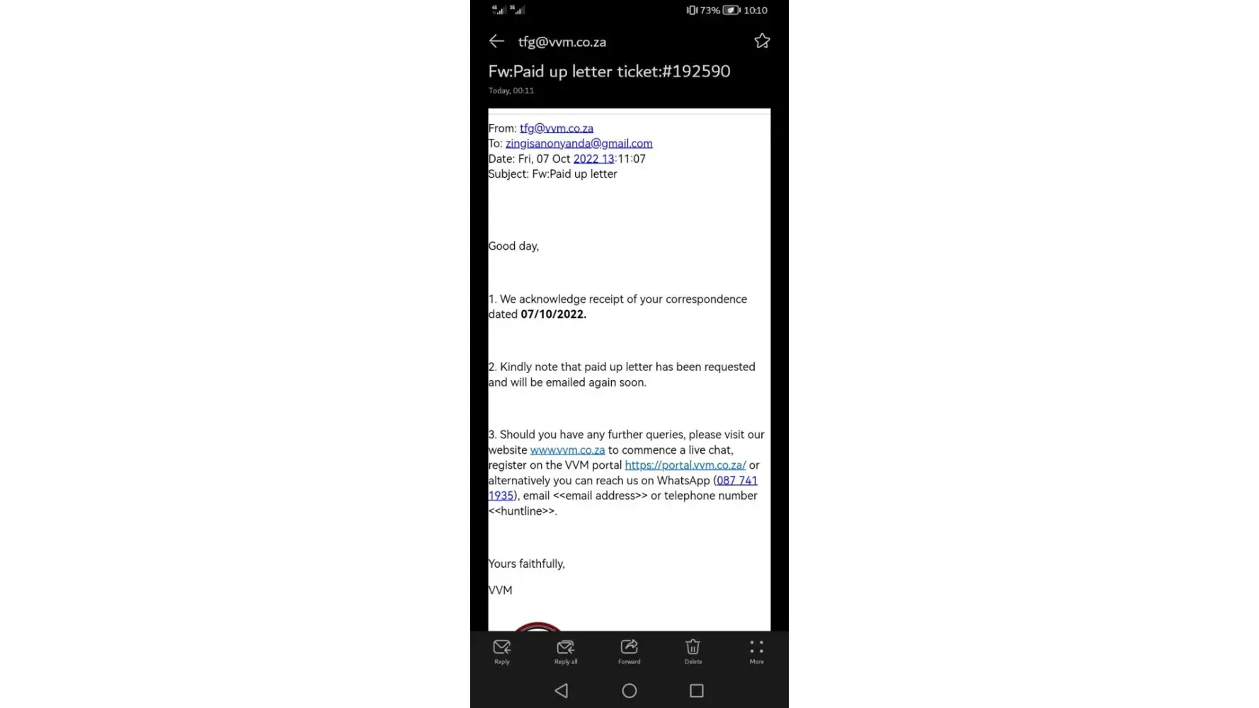On the 07th of October 2022 I wrote an email to [protected]@vvm.c.za email address to resend of forward my paid up letter they sent to me o. 23rd of November 2021. They relpy to my emails that they need reference number which I included in my email as a subject. I sent again another email explaining why I need it to be forwarded or resend, they ask for my ID number and I've been phoning you guys a lot I've been send to this side and that side and the your people are rude.They want to send me to homechoice while I don't have anything to do with a homechoice.