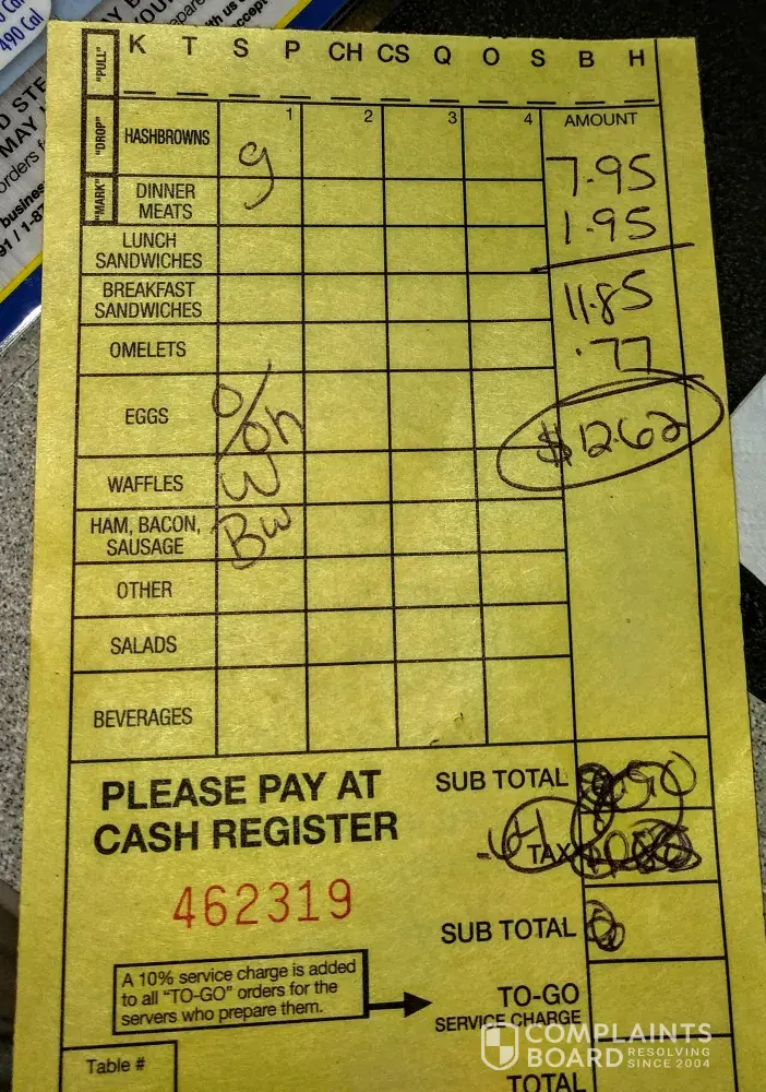 my biscuits (which they served cold once the gravy was ready). We get our checks and his says $7.95+$1.95=$11.85+$0.77 tax for $12.62 when we asked
