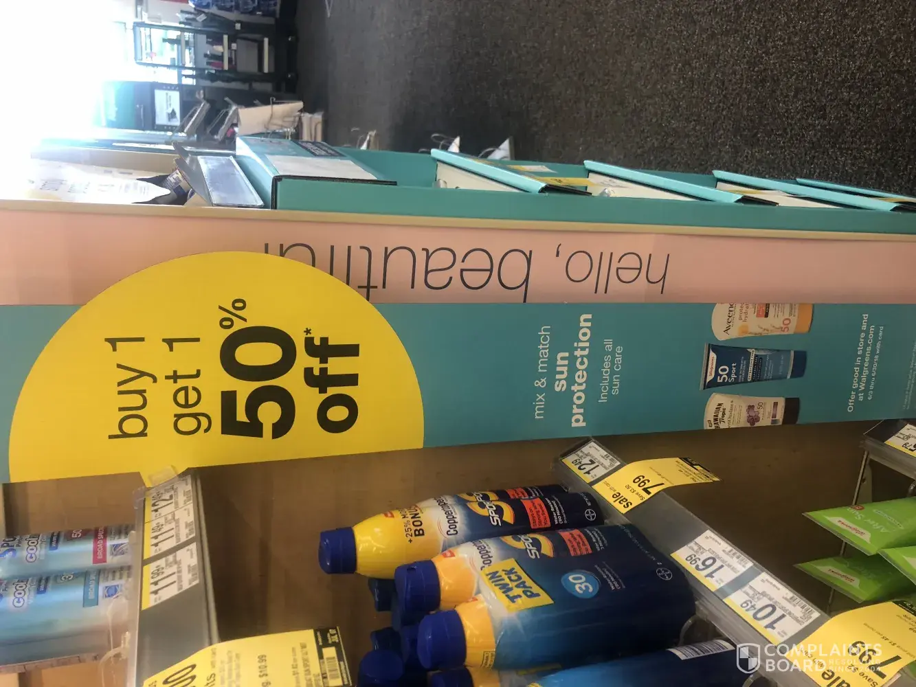 On 7-5-2018, my sister and I went to the store the sun are products were advertised as buy 1 get one 50% off, I purchased Walgreens spf 50 for $12.99 and a spray bronzer for $11.49 the cashier gave me $2.00 off on my savings reward card. I should have been given 50% off. The 2nd one. Do they need to train their personnel better. The cashier was also very rude and not very knowledgeable about the location of items in the store or the sales.