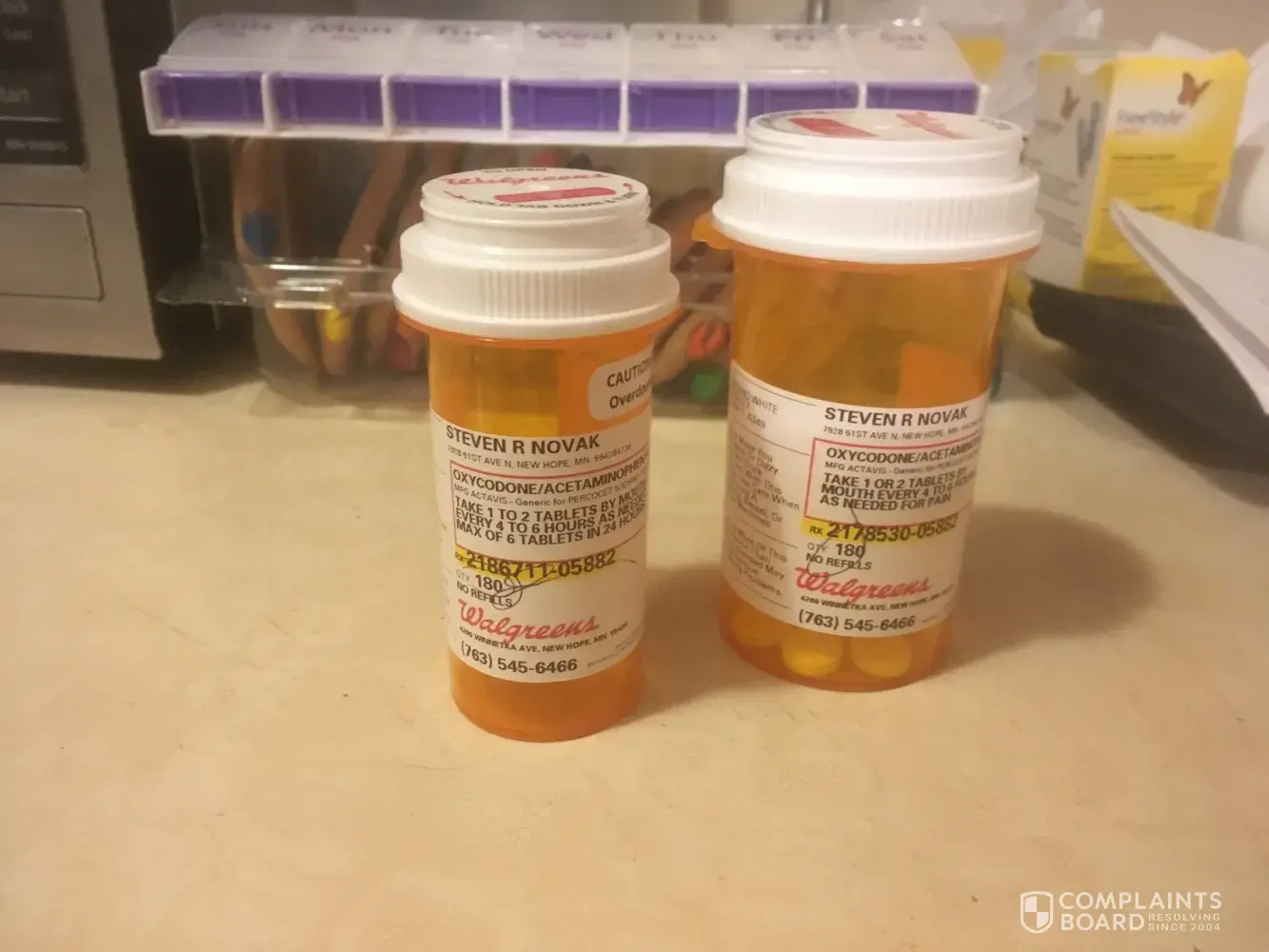 I currently take medications for my back. One of these is Percocet. I have been using Walgreens for my prescription needs. My October prescription was shorted significantly, and because I had extra pills I didn't notice the small bottle they had given me. Now, I am running short and am facing withdrawal symptoms. I asked the pharmacy in New Hope, Minnesota about this and they flatly stated the count was right.