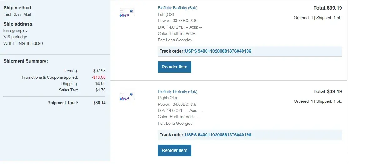 Thank you very much for listening to my complaint. I ordered the below Biofinity Contacts. One pair was ripped and I called to get it replaced. Walgreens told me to ask the manufacture to replace. The manufacture sent me back to Walgreens. Please help! All I need is a replacement mailing. I would really appreciate it, if you could possibly mail me one pair of contacts in replacement of the defective pair. Lena Georgiev