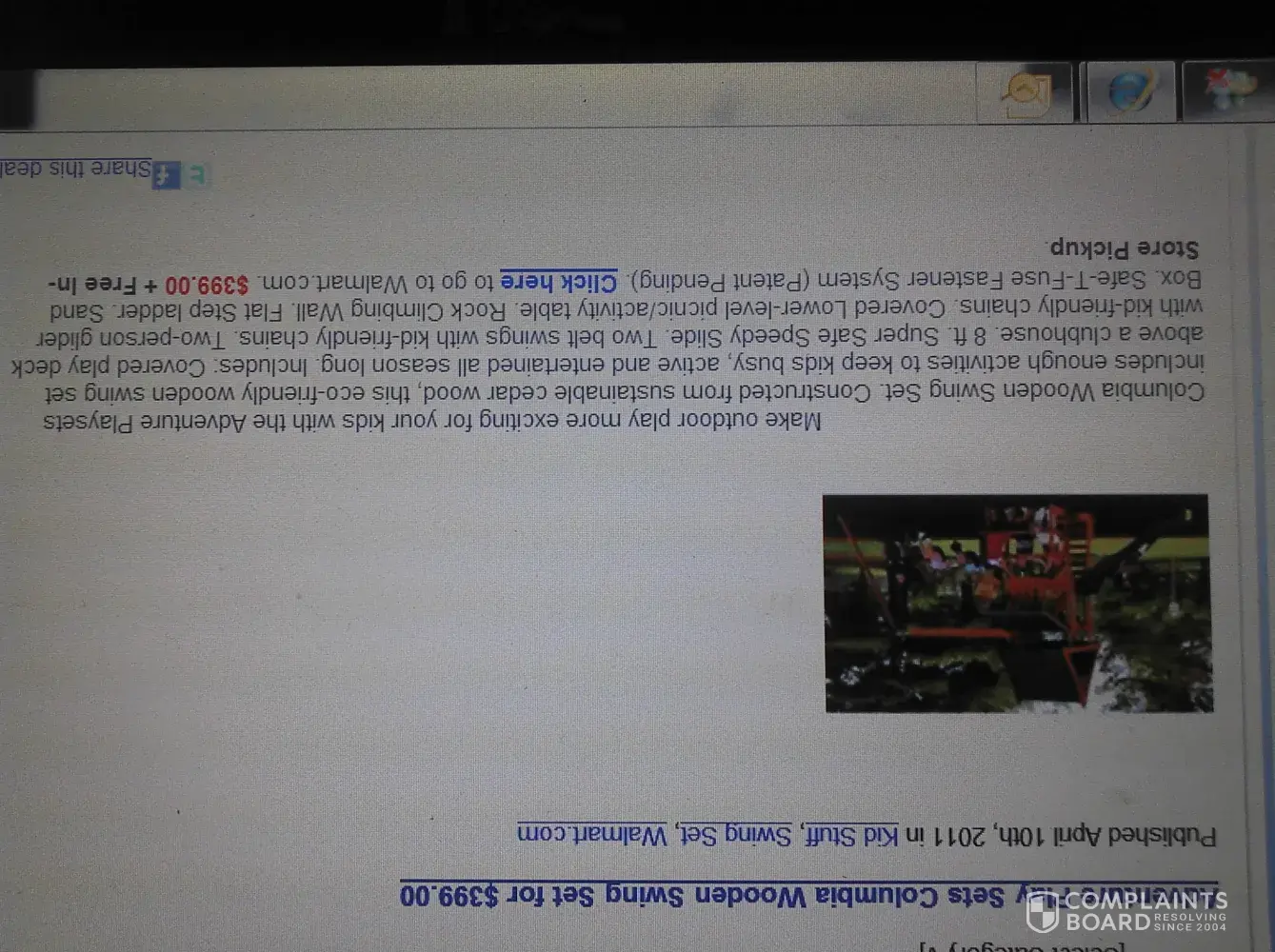 I am including a photo of the swing set that I ordered, being offered on www.bargainsaddict.com through Walmart.com for $399. This ad was posted on 4/10/2011. This is the swing set that I watched for a few weeks and eventually purchased, but it’s not the swing set that Walmart.com is sending to me.