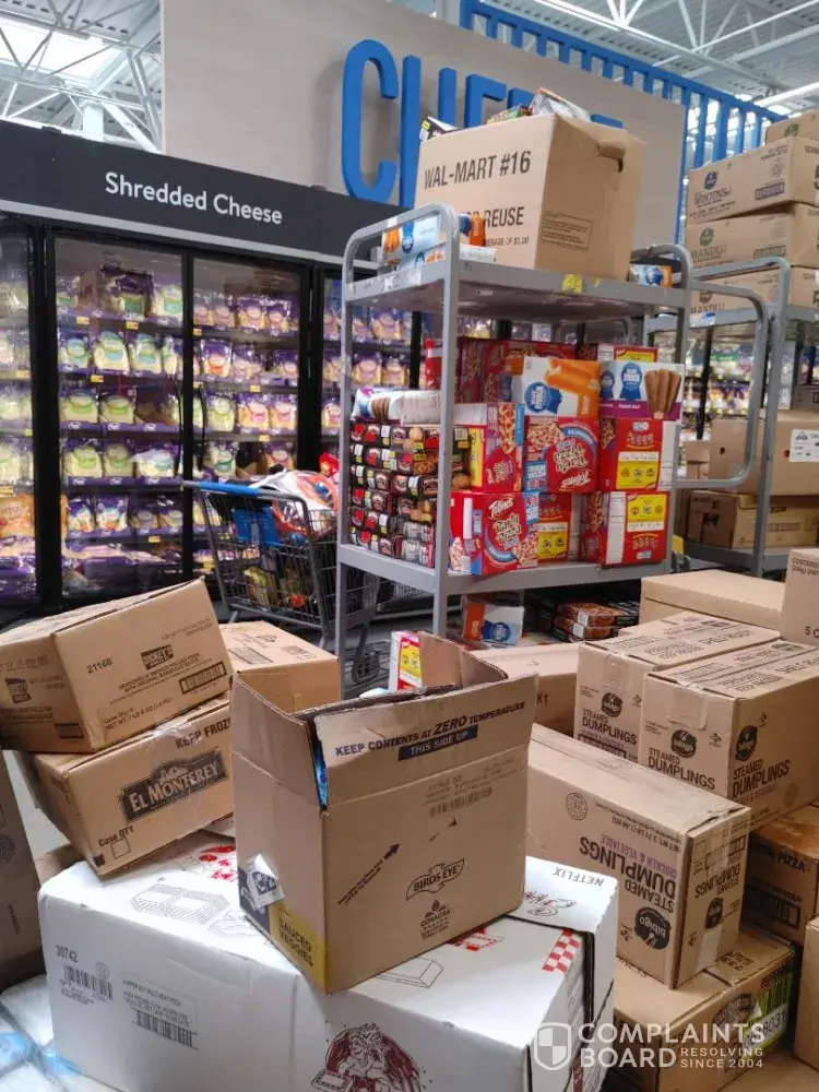 I was at store number 02834 today. I found a lot of frozen food sitting out thawing. This is not the first time I have come across this issue with Walmart. This would explain why most of your frozen products look to be refrozen. I have pictures that I will add to this report.