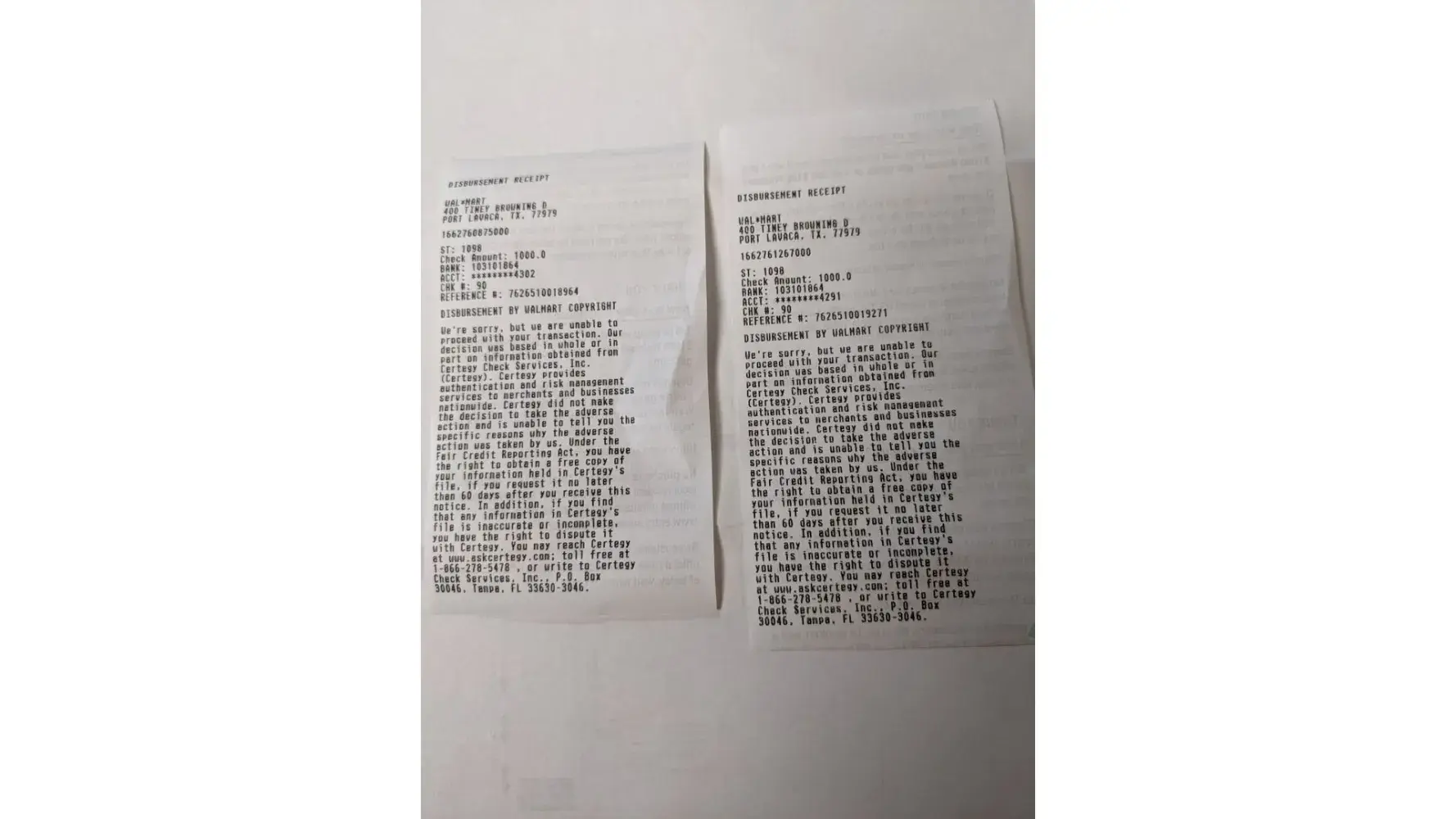 On January 11, 2022, I purchased two money orders from the Walmart store #01098, in Port Lavaca, TX. At the time of purchase, I was assured there would be no problem cashing them within one year. On September 9, 2022, I brought them to the store, where they were declined. I asked to speak to the manager, and was told two conflicting things: he was on...