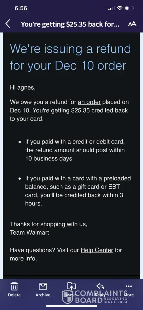 Dec. 13 - escalated to Walmart; agent said they would send an instruction to seller to refund and that, if no response, call back and Walmart will provide the refund. Indicated I should wait 72 hours for this to happen.
