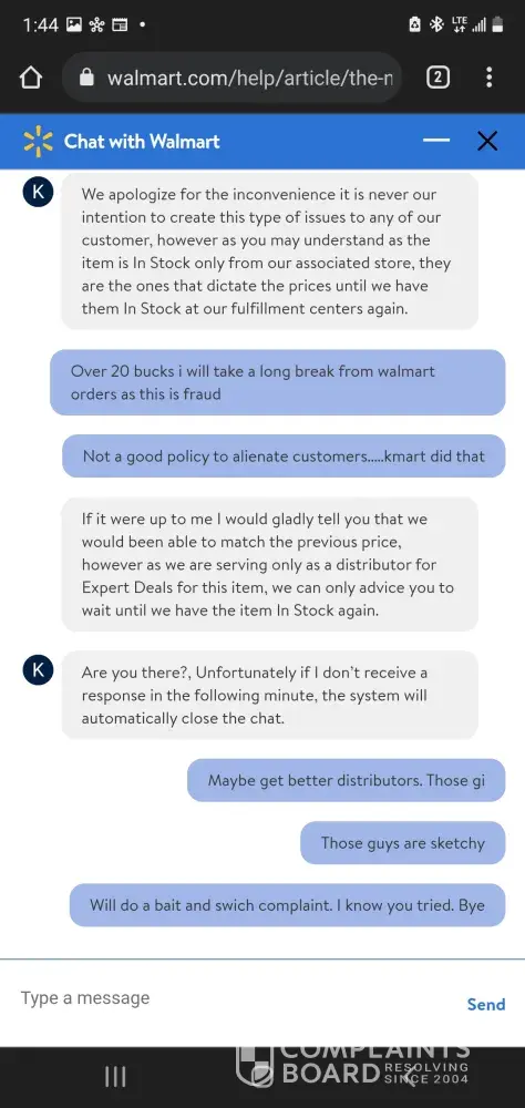 - informed further escalation is against Walmart policy.