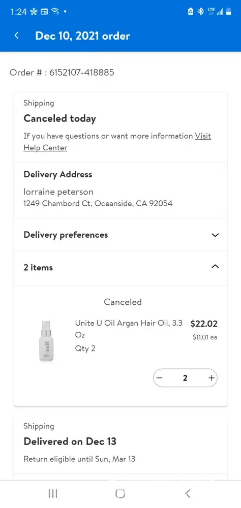 Nov. 13, 2021 - Walmart forwarded issue to UltraCanadian (the seller)