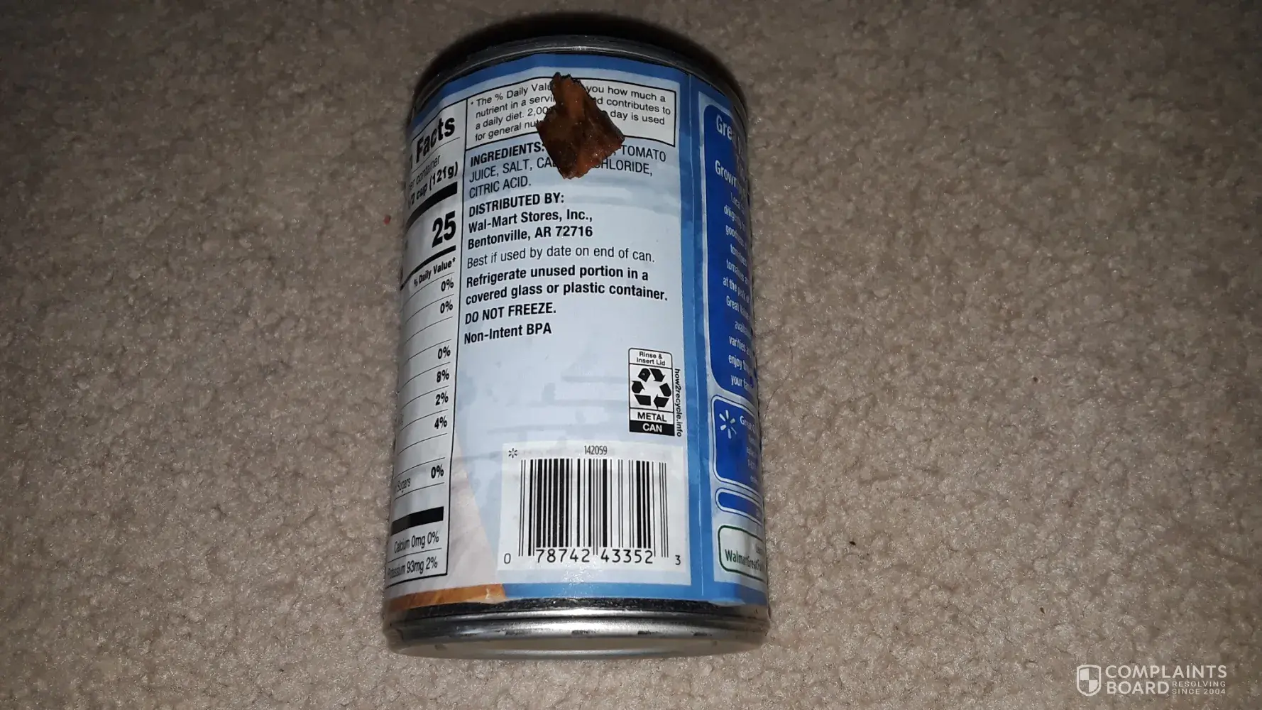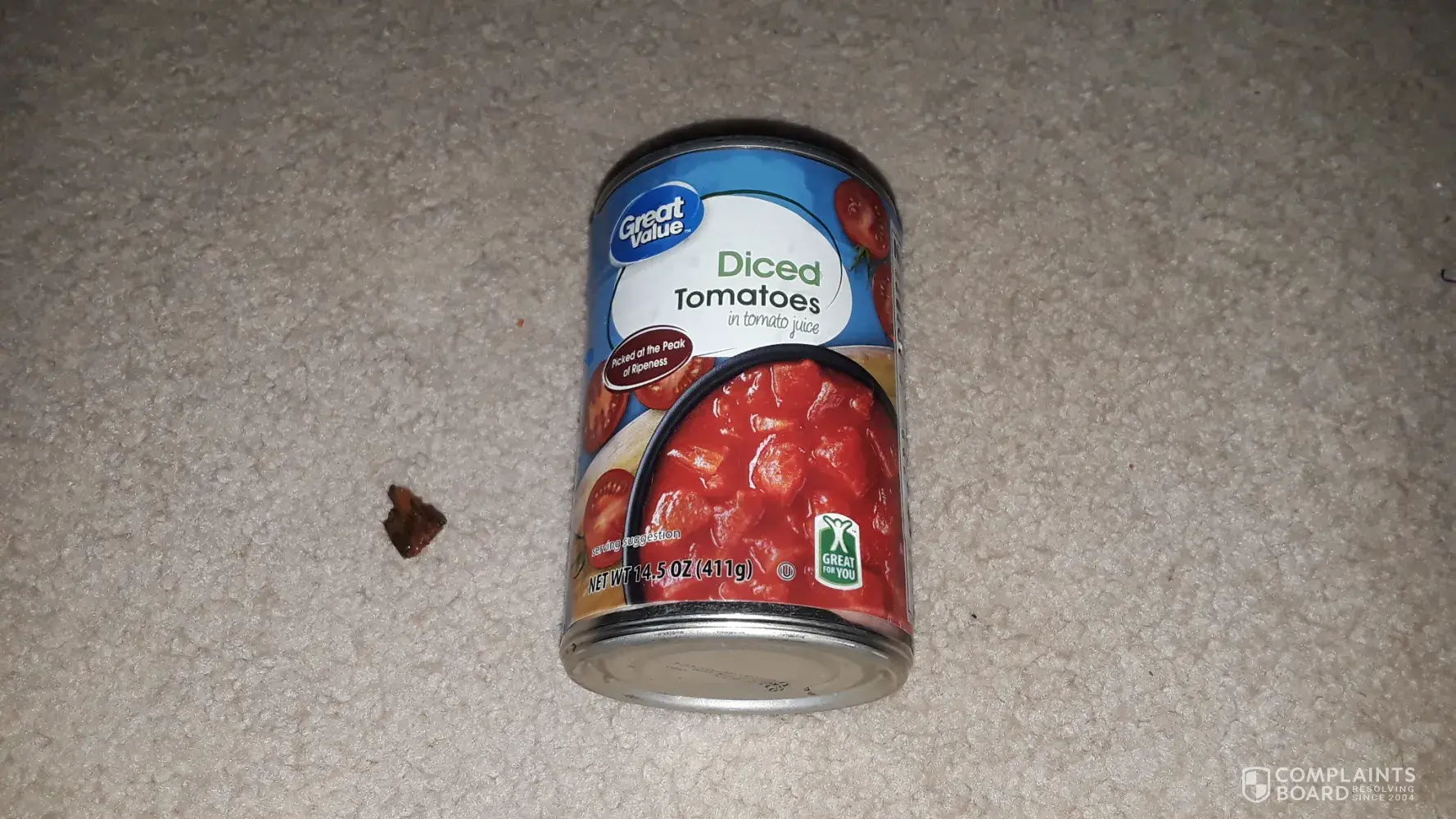 We bought a can of Great Value diced tomatoes from the Walmart in Coos Bay, Oregon. There was a small piece of wood inside the can, (It measures roughly 1/2"X 1/2" X 1/4") and I would like some substantial compensation for this, since it wasn't discovered until it was in my mouth. We still have the can, and the piece of wood, which you can see in the pictures. We find this totally unacceptable. Something like this should have never happened, and opens up the possibility of a lawsuit. Where are the quality control measures?