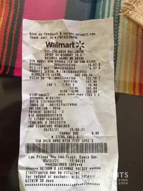 I purchased a 50" Vizio TV on clearance and Walmart in Ruidoso, NM on 05/31/2021 at 3:00pm, which was yesterday. The TV works but flashes a white screen repeatedly at an interval of about 3 seconds, which makes the TV unusable. I brought the TV back to the Walmart customer service center in Ruidoso, NM and was told there are no returns on clearance items period. I refused to accept this as a legitimate answer and asked to speak with the manager. The manager coincidentally walked by last night while i was deciding on which tv to buy and suggested that i "buy the big one, " which was also on clearance for over $600. When he arrived at the customer service desk, he told me that buying one of those TVs is a gamble. I told him that it's been less than 24 hours and Walmart sold me a broken TV. He stated that is the store policy on clearance items. I stated that this should have been disclosed prior to purchase. I have the receipt and the item is in the same condition as purchased last night.