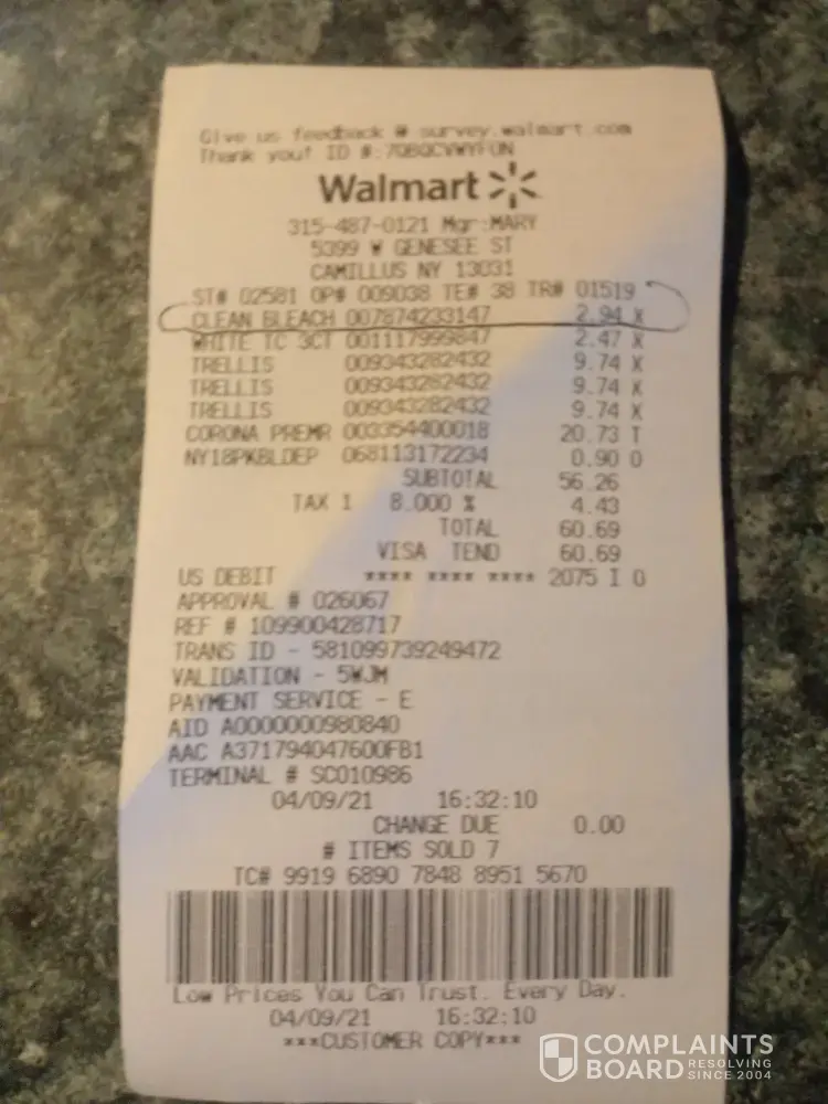 On 4/9/21 @ 16:32pm store # 02581 I purchased the Great Value bleach along with some other items. I noticed on the shelf that there were a couple of bottles that seem they were missing product & chose a full bottle. After cashing out I proceeded to load my trucks back floorboard. I had placed the bottle of bleach on the floor and had items around it. When I...