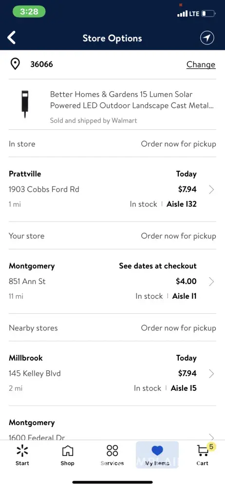 Tuesday, April 20 I checked the Walmart app for the bollard path lights. They were listed in stock at Ann Street, available for same day pick up, and the price was $4.00 each-marked down from $7.94 each. I drove from Prattville, AL to Montgomery, AL to purchase said light. Upon arrival at Ann Street, there were NO lights like I wanted to be purchased. Thi...