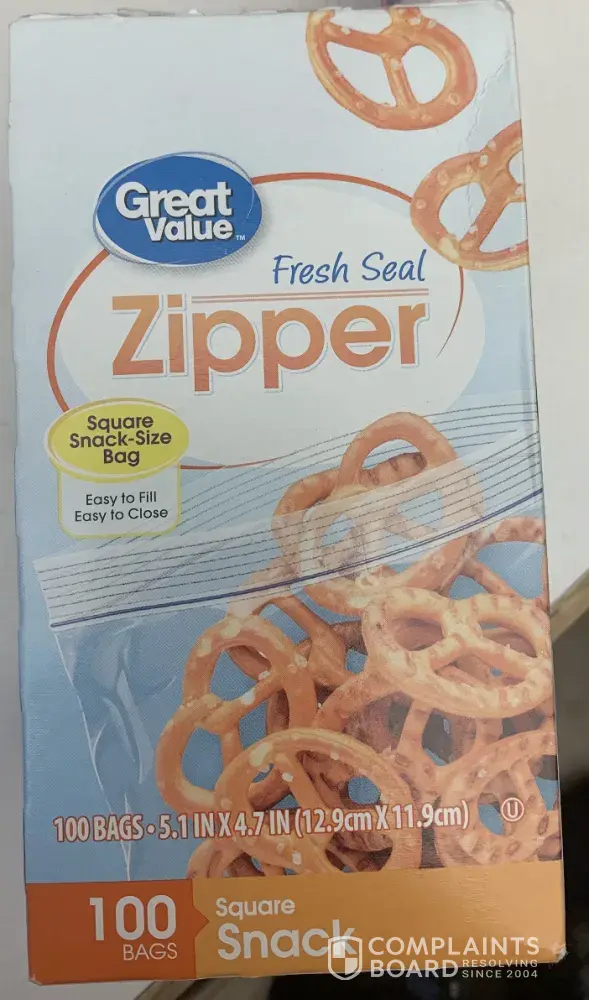 Read full complaint1. Service 2. A product (great value zipper bags)