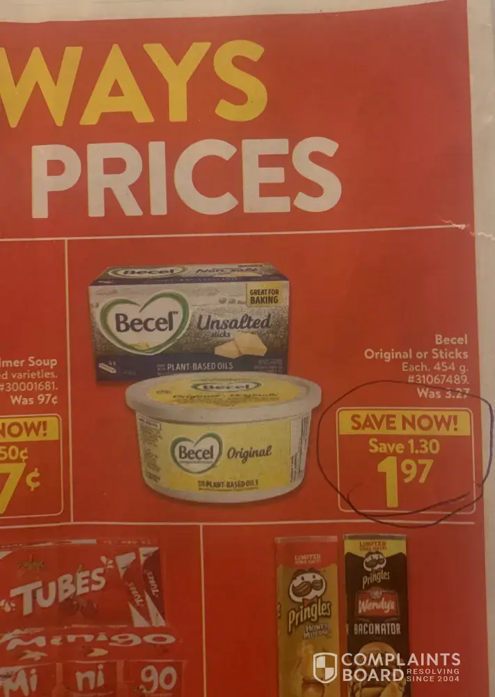 1. I purchased Becel on sale for someone who had a multiple list of health problems. It was the wrong kind. I returned it & told the girl this snd that i had to get one that is low in salt & cholesterol. After returning them I went to the cooler to get proper ones and upon returning to the girl she refused to give them to me at the sale price saying that the price had changed overnight. I said I was just returning the other ones for the low salt low cholesterol ones & they were on both on sale. She refused to ring them up. They were on for $1.97.