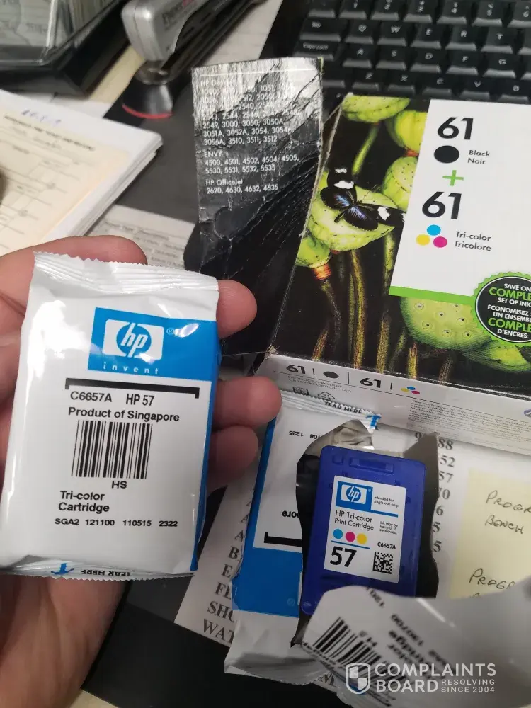My wife purchased a HP printer cartridge HP61 on the box on 4/7/2019. When she got home, I opened the package (the box) and opened one of the aluminum wrappers and noticed the cartridge was hp57. It appeared to be packaged wrong. My wife went back to the store to swap it out and they would not. It was a two pack (color and b/w). The other cartridge wa...
