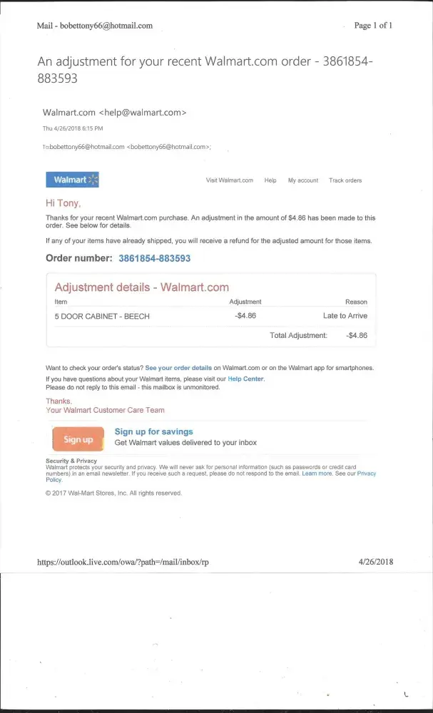 My name is Tony Bobet from New York City. I am filing an complaint to Walmart.com that located at 2100 88th Street, North Bergen, New Jersey, 07047. I order on April 25, 2018. I order an 5-door cabinet for $52.89, the order number is #[protected]. The carrier is FedEx.com. The tracking is [protected]. I have been here all day. they say they were an attempt of deliver my item. they think have a business. they are stupid.