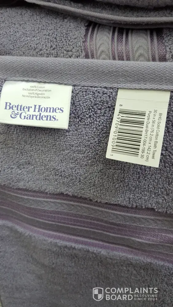 I purchased better homes & gardens 5 bath towels - 2 hand towels & 4 wash clothes from walmart in wood river, il. We followed washing instructions on label. We purchased the purple dust color towels & pink splotches appeared on them which looks terrible after one washing. Walmart refused to let me return them because they were washed. I am very upset because these towels were so nice & a perfect match to our main bathroom. Were the washing instructions incorrect? wash warm water by themselves - do not bleach - tumble dry low.