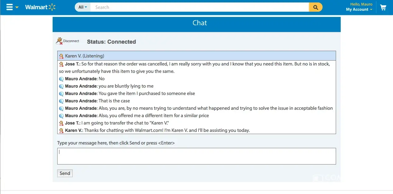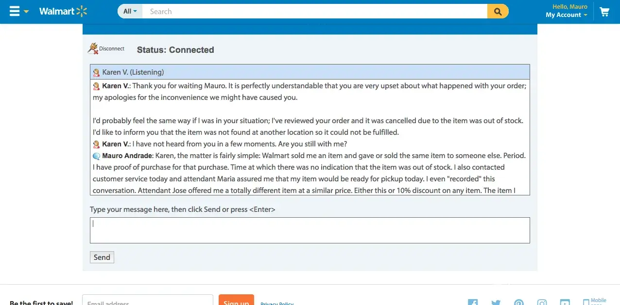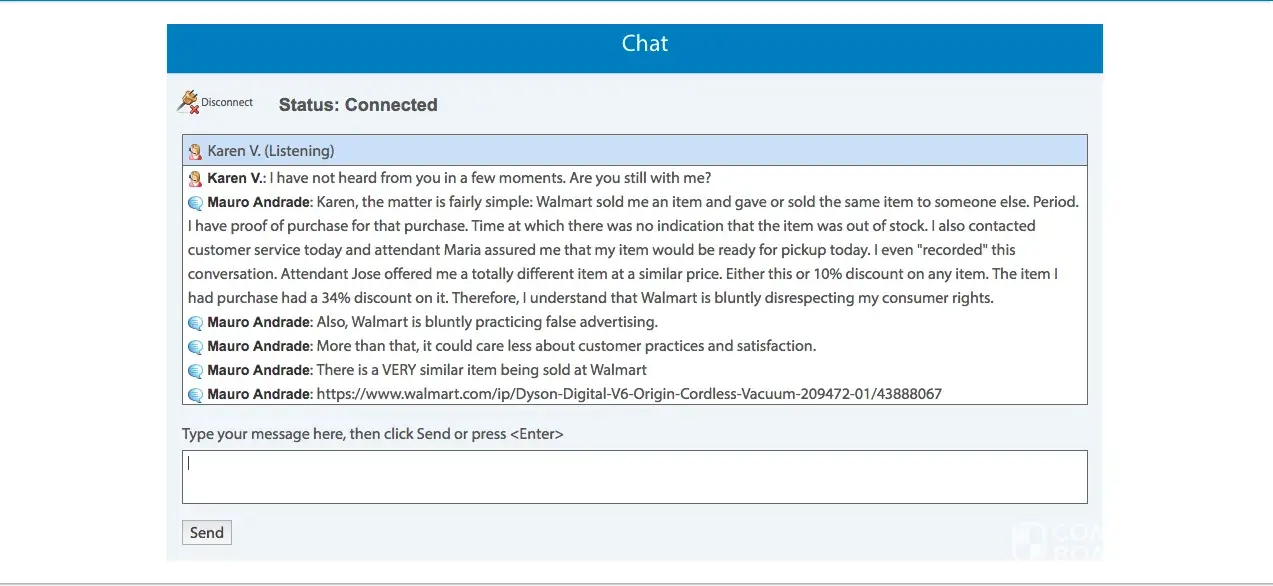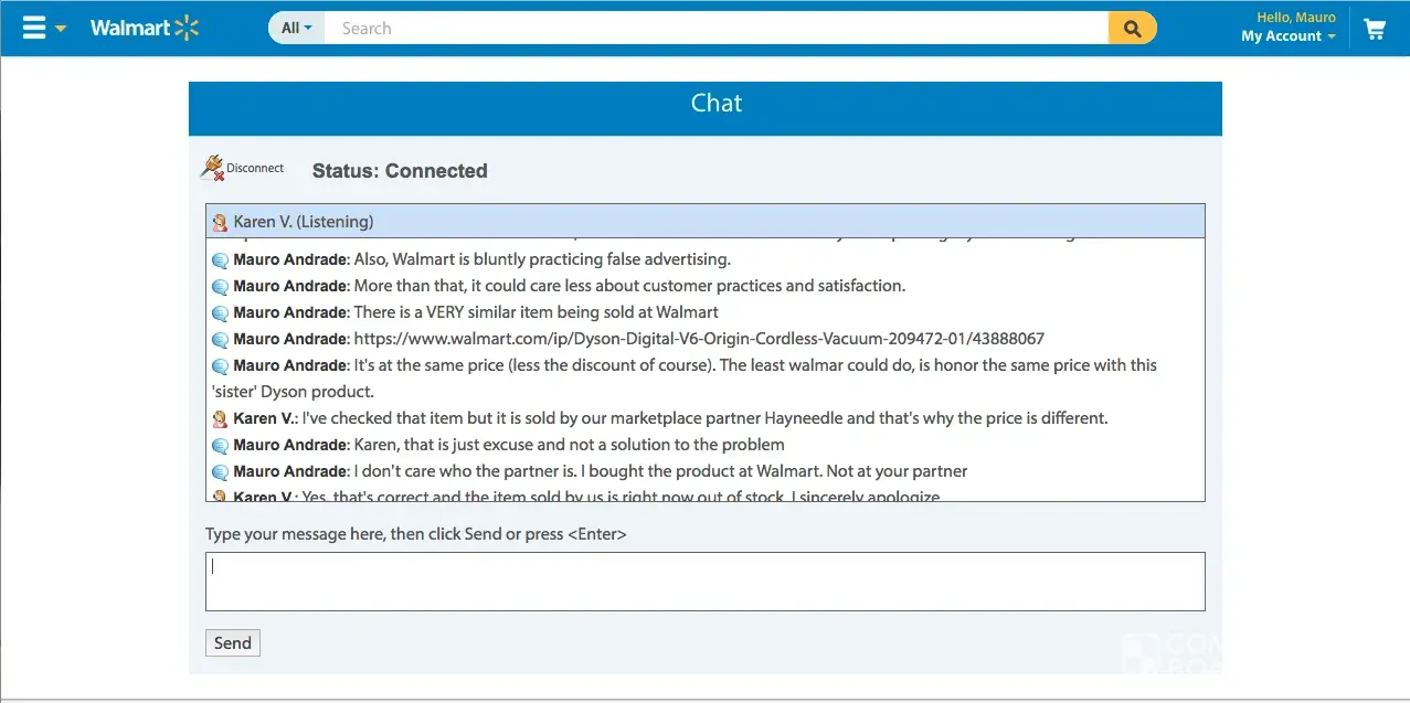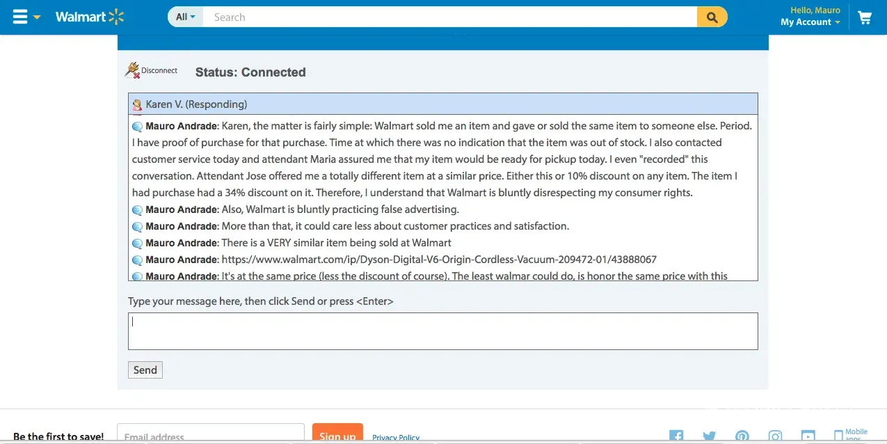 I purchased a Dyson V6 Slim Cordless Vacuum during Black Friday thru Walmart online store. I received a purchase confirmation within minutes after the purchase as well as an email telling me that the item would be ready for pickup at the store within the same day. The item was not available at the store when I went to pickup it up the following day. So I contacted customer service today (11/26) and chatted with attendant Maria M. She assured everything was ok with my purchase and that my item would be ready for pickup today Saturday (11/26). As a surprise I received an email from Walmart saying that my purchase was cancelled. I once again contacted Walmart thru online chat and attendant Jose T told me that the item was cancelled because it was out of stock. I replied that this was unacceptable practice and that Walmart has sold me an item and delivered my item to another customer or to someone else. He offered me to buy a totally different item at a higher price as a compensation for their 'mistake'. I rejected the offer. he than proceeded as to offer me a 10% discount on any purchase at Walmart. I told him that this was once again unacceptable and the the discount I had on my item was at 35%. I even mentioned that a VERY similar item is being offered at the online store and I would be more than pleased to buy the similar item at the same price I had purchased the original price. After waiting for almost an hour, attendant Jose came back with no solution and with a rather automatic answer as to say that the item was 'unfortunately' out of stock. I did not settle for such answer. He than proceeded to forward our chat to supervisor Karen who had the same automatic answer as attendant Jose. She only added that it was not Walmart's fault because the item was being sold by a partner! What? I didn't by the item from any partner. I bought the item from Walmart! I have been escalated to attendant Whittley P. But no luck and the problem persists. This is clear consumer violation as well as false advertising as I understand. Stay away from Walmart.