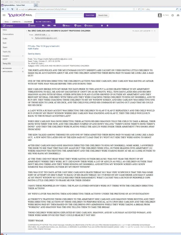 My wife Joan Wagar was having an affair with a Portland cop named Eric Carlson and he was acting as a double to set me up as a pedophile!