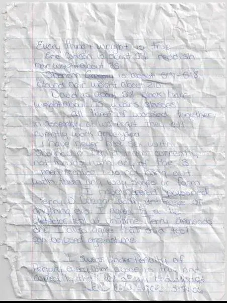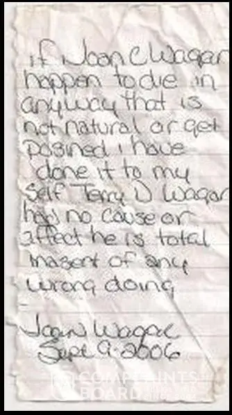 Joan Wagar's signed confession that she use's antifreeze as poison, and she tossed this signed confession at me when I was bedridden and unable to get out of bed because my wife poisoned me, and there was no one I could hand it to that cares!