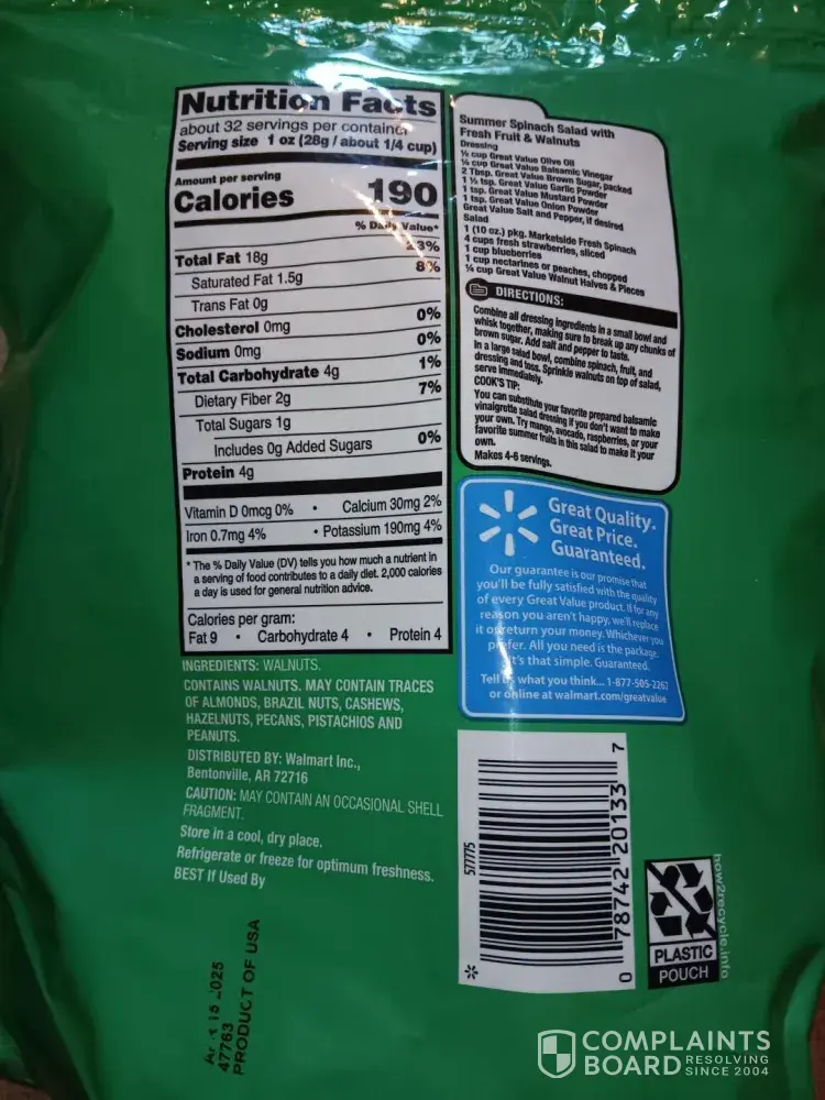 Opened a bag of walnuts great value and found a string inside of bag. Picture attached. Hoping that there will be no issues when I finish the bag. Just make me wonder what else may be in the bag. Not pleased with finding foreign objects in walnuts.