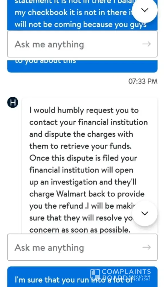 I have spoke with my bank daily. I have contacted Walmart almost daily, and I get the same generic assurance of my refund will be sent soon, but nothing is resolved.