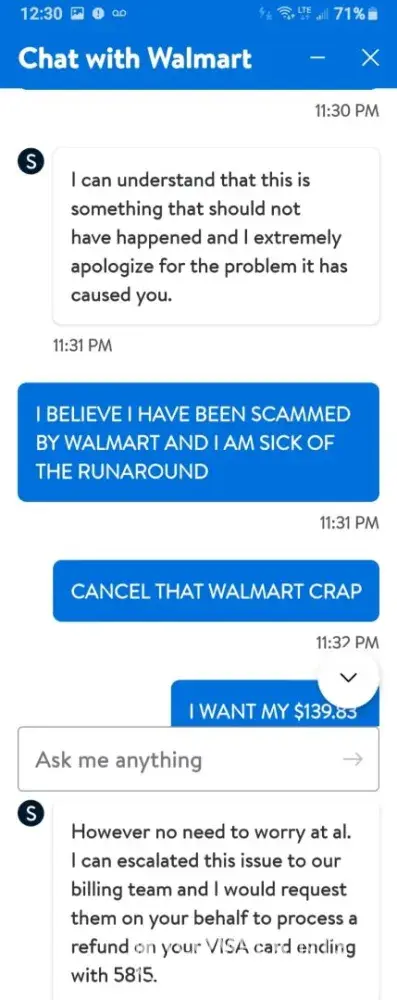 Don't let up until you get what you're owed. You've got the right to demand better service, and it's time Walmart steps up and does the right thing. Stay strong and keep fighting for your refund. You deserve it, and they need to deliver.