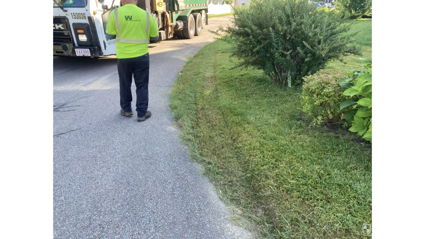 Waste Management recycle truck #153036 Ma. Lic. # T44-895 drove over my lawn ! The driver, Alexander, admitted that he made a mistake and cut the turn too close to the edge.