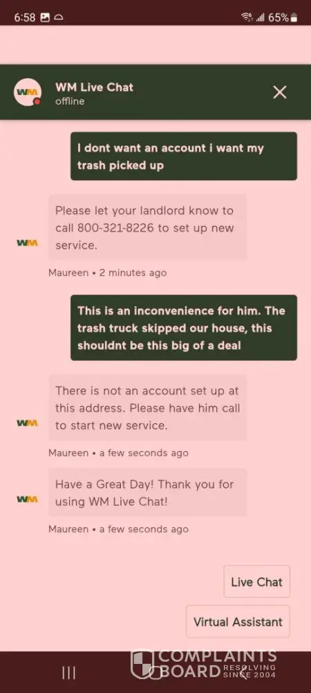 I tried to chat and Maureen was rude and canceled the chat before we were done. My trash was skipped on 2/19/25