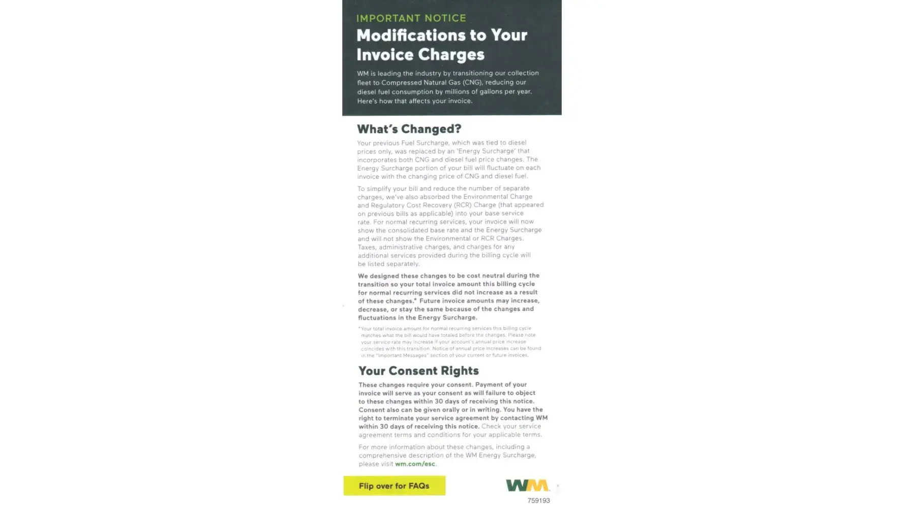 This invoice constitutes an offer by WM to provide service to you for a specified period. By paying this you agree to continue service during the specified service period and to the terms of service at www.wm.com/OMR, with no refund(whole or partial) for early cancellation, unless such refund is required by law, regulation or contract. If services are cancelled after initial acceptance, you will be assessed a Cart Removal charge of up to $75 plus applicable taxes and charges including fuel surcharge, environmental charge and regulatory cost recovery charge, art removal charge is nx contract.